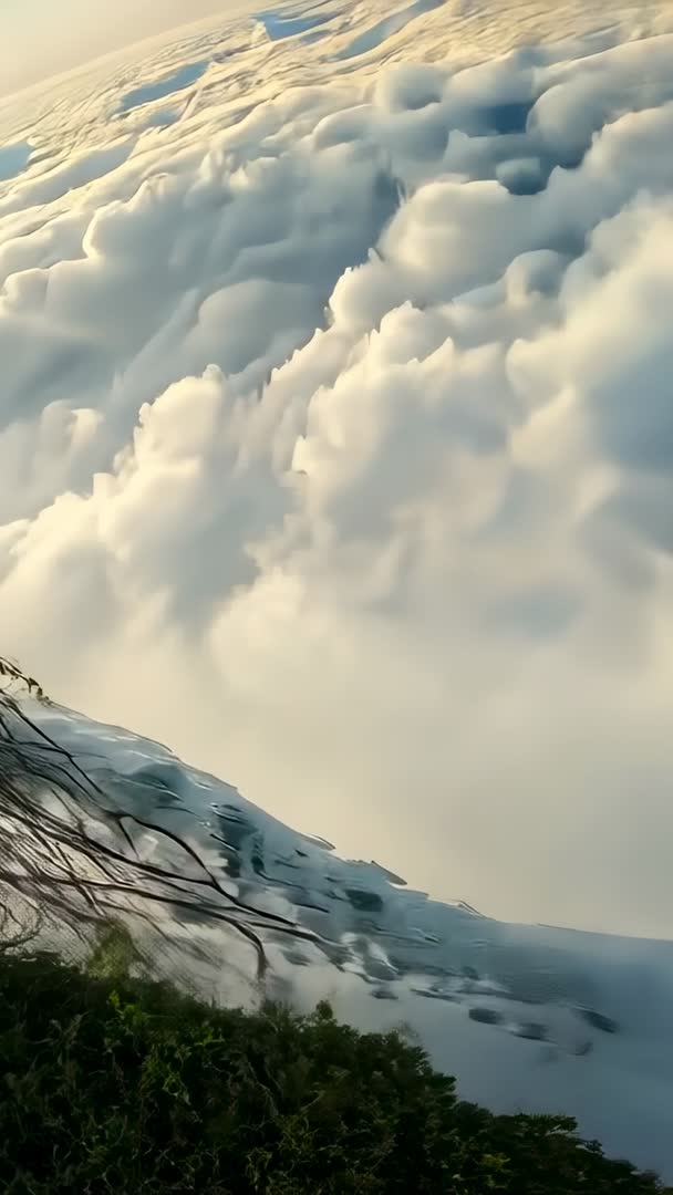AI Generated Image. Panning vertical drone video capturing sunlit sea of clouds spilling into mountain valley from cliff rim. Featuring soft alpenglow on cloud tops, sweeping horizon, dramatic ridge line and low hanging mist for strong sense of elevation and scale. Tall aspect ratio optimized for social reels, mobile-first storytelling and vertical displays. Ideal for travel openers, tourism campaigns, nature documentary B-roll, mindfulness or meditation backgrounds, outdoor adventure promos, hiking gear spots and cinematic title sequences. Suggestions for use: pairing with ambient music and slow tempo for calming mood, overlaying text or logo on upper sky area, applying subtle color grading to enhance warm highlights, adding slow zoom or parallax for dynamic motion. Delivering immersive aerial mood for marketing, editorial and content creation needs.