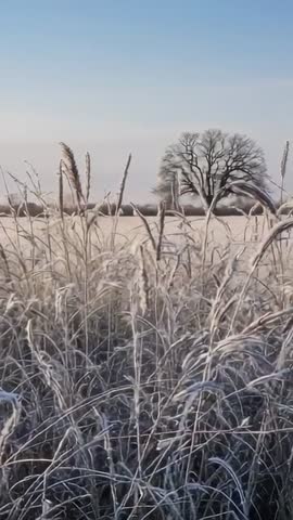 AI Generated Video. Panning across frosted tall grasses in foreground, camera moving right to reveal solitary leafless oak tree on distant horizon under pale blue winter sky. Soft winter light highlighting hoarfrost on stems and seedheads, creating textured foreground and wide negative space in upper frame for text overlay. Conveying calm, contemplative mood suitable for seasonal marketing, environmental storytelling, weather report B-roll, social media reels, and mobile ad campaigns. Technical details: vertical 9:16 aspect ratio, slow lateral pan, neutral color palette, strong foreground texture with clear horizon line. Usage ideas: pairing with ambient sound for relaxation or meditation content, using as looping background for app splash screens and story ads, placing headline over sky area for hero banners, adding lower-third text above grass line for editorial credits or weather captions.