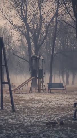 AI Generated Video. Panning vertical footage showing fog-filled park playground with slide tower, bench and bare deciduous trees. Camera moving slowly through soft morning mist while small flock of birds foraging across patchy snow and frozen grass. Desaturated color palette creating moody, cinematic atmosphere and strong sense of solitude and quiet. Useful for film opener, social media vertical ad backgrounds, b-roll for documentary on urban solitude or seasonal change, background for mental health campaign, or stock for atmospheric travel and weather reports. Editing suggestions: keeping slow tempo, adding ambient pad or sparse piano, introducing subtle wind SFX, applying gentle teal-brown grade for cinematic mood. Composing guidance: placing title or lower third in top or bottom safe zones to avoid obstructing central playground elements. Looping-friendly for short social clips and vertical reels.
