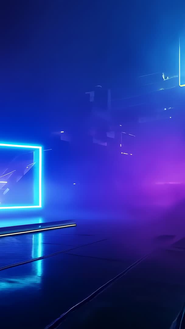 AI Generated Video. Panning vertical neon stage featuring cyan illuminated rectangle and drifting purple haze over wet reflective floor. Providing cinematic techno atmosphere for mobile-first content, social stories, reels, vertical ads. Offering strong foreground reflections and negative space for text or logo overlays, title animations, product reveal sequences. Working well as background for music video intros, event promotions, nightclub visuals, gaming trailers, tech product launches. Loopable when trimmed to seamless start/end frames; recommending slow motion or mild stabilization to emphasize glow and reflections. Suggesting color grade shift toward cyan or magenta, adding ambient synth soundtrack, placing lower third or call-to-action in upper right area for best contrast. Optimized for 9:16 vertical format, supporting TikTok, Instagram Stories, Snapchat, YouTube Shorts and mobile ad campaigns.
