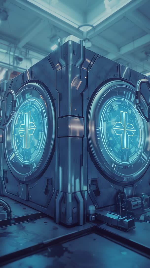AI Generated Video. Panning vertical shot revealing large metallic cube with glowing blue circular interfaces housed in industrial lab environment. Camera moving from floor toward top corner while LED rings and holographic symbols pulsing with data streams. Surface finishes showing brushed metal panels, vents, and cable conduits suggesting powerful energy core or server unit. Color palette centering on cool blues and teals with high-contrast metallic highlights, creating cinematic high-tech mood. Usage suggestions: - Using as opener for futuristic tech promo, product reveal, or sci-fi trailer - Using as vertical background for social media ads, app previews, or smartphone commercials - Using as looping element for trade show booth displays, motion graphics, or exhibition screens - Using as visual asset for game cinematic, concept art showcase, or virtual environment mockup - Using as overlay background for UI demos, cybersecurity presentations, or AI research videos Technical notes: - Vertical orientation optimized for smartphone and social platforms - Clean negative space available for logo or headline placement on top and bottom - Motion-friendly composition allowing seamless loops, parallax reveals, or animated HUD overlays