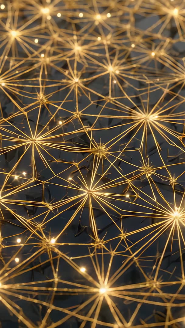 AI Generated Video. Vertical footage showing slow panning across warm golden starburst filaments arranged over deep glossy black surface, producing shimmering radial highlights and delicate metallic threads. Shallow depth of field and soft bokeh points emphasizing intricate macro texture and three-dimensional relief. Visual tone blending luxury and futuristic tech, conveying connectivity, energy, and refinement. Usage suggestions: using as intro or looping background for brand promos, luxury product commercials, jewelry and watch advertising, tech and data visualization content, vertical social media reels, mobile wallpapers, UI hero sections, event openers, title sequences, and VJ visuals. Pairing with ambient electronic music or minimal cinematic score for dramatic impact. Working well with color grading into cool blues or warm ambers to adapt mood. Providing eye-catching, high-contrast footage suitable for marketing, editorial, and creative motion-design projects.