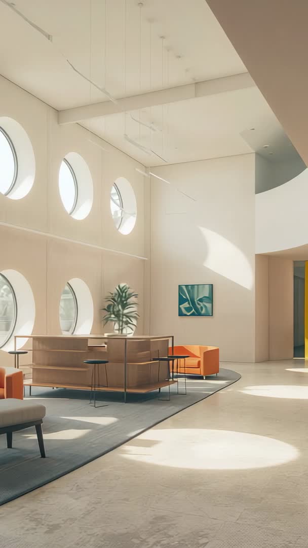 AI Generated Video. Panning vertical footage following slow camera movement through minimalist midcentury atrium with circular porthole windows. Warm daylight casting round light pools on terrazzo floor while sun moving toward yellow door. Beige seating and orange accent chairs framing central lounge with low-profile modern furniture and mezzanine above. Potted plant and abstract wall art adding visual interest. Clean lines, soft shadows, neutral palette creating calm inviting mood. Suggested uses: architecture reels, hotel lobby promos, corporate branding videos, real estate walkthroughs, interior design showreels, social media vertical ads, website hero sections, TV commercial openers, mood board presentations. Best for projects needing modern minimalist atmosphere, warm daylight ambience, or midcentury design references. Edit-friendly composition offering smooth panning for titles, lower thirds, or product overlays.