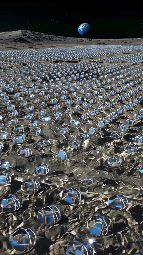 AI Generated Video. Panning across vast grid of polished reflective domes resting on cratered regolith, Earth rising on distant horizon. Camera movement revealing repeating geometry, mirrored surfaces catching blue Earth reflections, and stark contrast between shiny domes and textured lunar soil. Visual composition pairing large-scale repetition with intimate foreground detail and vertical framing optimized for mobile consumption. Providing cinematic footage for sci-fi film sequences, title intros, and social media reels. Serving concept illustration for lunar architecture, mirror-based solar farms, or extraterrestrial research bases. Fitting as dynamic loop for virtual reality environments, game backdrops, and architectural visualizations. Useful for editorial pieces about space exploration, renewable energy concepts, and future colonization ideas. Delivering high-impact background for technology campaigns, museum exhibits, and creative motion design projects.