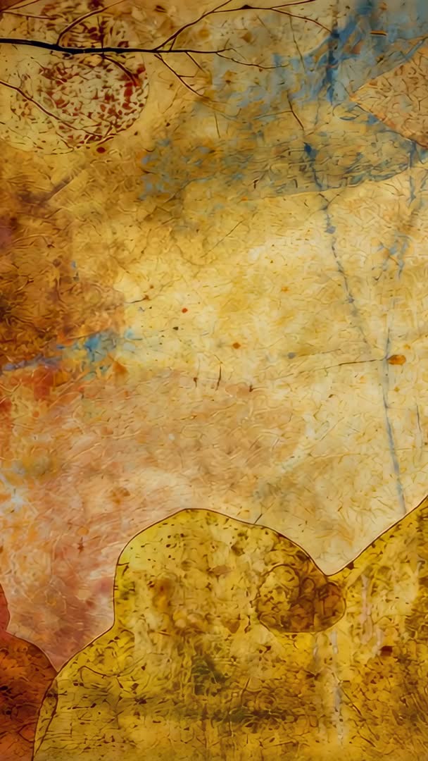AI Generated Image. Panning vertically across backlit parchment-like panel, revealing warm amber pigments, translucent layers, and circular motif near upper left. Soft backlighting and subtle blue accents creating painterly texture, fine cracks, and organic stains, evoking vintage patina and hand-crafted materials. Serving well for gallery promo reels, art documentary sequences, interior design mood pieces, or background for title cards and social reels. Providing versatile texture overlay and color palette reference for graphic design, web hero banners, packaging mockups, and motion graphics. Delivering slow, contemplative pace for cinematic edits and premium brand visuals.