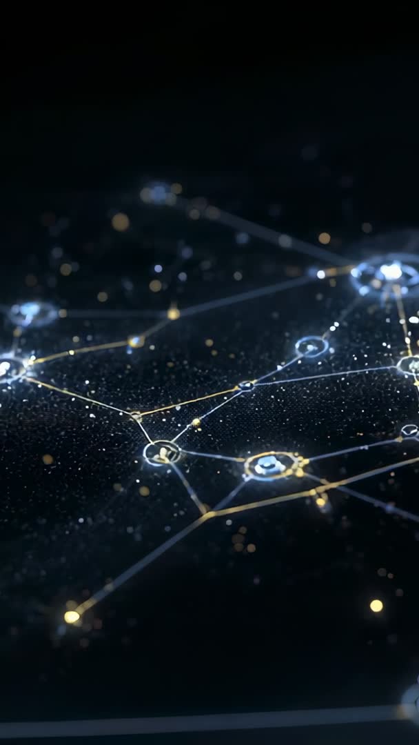 AI Generated Video. Panning camera revealing blue and gold holographic node network across dark plane, mapping digital links with glowing lines and tiny sparks. Close depth-of-field showing shimmering particles and soft bokeh, creating immersive, high-tech atmosphere. Visual language leaning toward futuristic data systems, network topology, and electronic circuitry. Ideal for use as opener or background for tech conference promos, app demos, cybersecurity explainers, blockchain or AI marketing, fintech presentations, and vertical social ads. Works well behind overlay text, lower thirds, product mockups, and title sequences. Recommended pairing with ambient electronic soundtrack, slow zoom or subtle parallax, and color grading to match brand. Delivered in vertical 9:16 composition, suitable for mobile stories, reels, and hero sections on websites. Looping-friendly for continuous playback and easy integration into motion design projects.