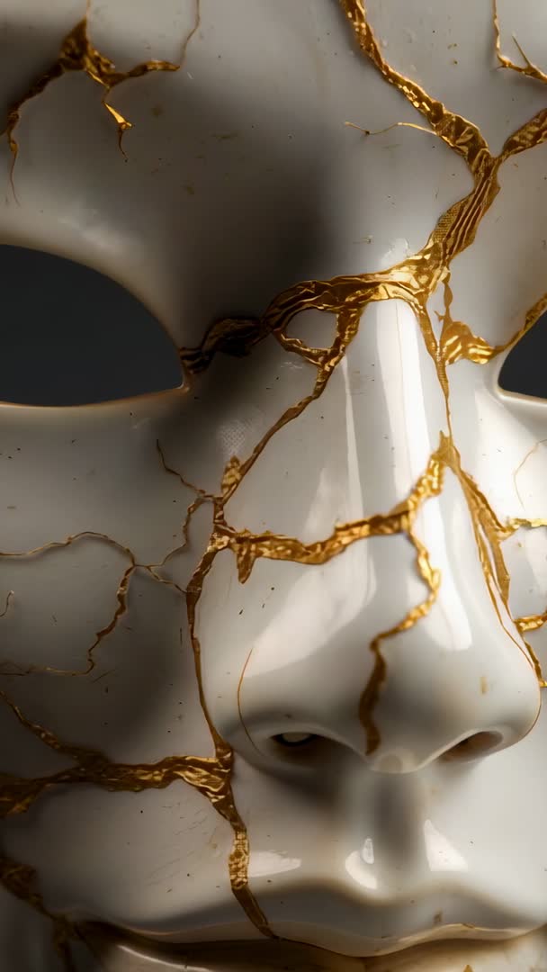 AI Generated Video. Panning camera revealing white porcelain mask repaired with kintsugi gold seams. Closeup vertical footage highlighting glossy ceramic surface, delicate fissures, and reflective gold veins under soft studio lighting. Visual mood balancing fragility and resilience, exploring themes of repair, transformation, beauty, and imperfection. Composition working well for slow motion reveals, match cuts, and cinematic transitions. Usage suggestions: using for social media reels and short-form video content, gallery promo clips, art restoration documentaries, luxury brand intros, meditation and mindfulness visuals, editorial video for design and craft stories, hero background for websites and presentations, creative transitions in film projects. Technical tips: crop safe for vertical platforms, recommend subtle color grading to enhance gold contrast, consider looping for ambient background use.