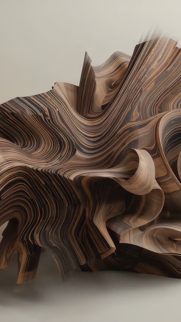 AI Generated Image. Video showing slow vertical pan across laminated wood sculpture resting on studio floor, revealing ribbonlike layers and undulating folds. Close-up passages emphasize striped grain, layered laminations, and sculptural curvature. Neutral background and soft studio lighting enhancing texture and depth. Vertical orientation optimized for mobile viewing and portrait platforms. Useful for art documentaries, contemporary design promos, interior design mood reels, material showcase for furniture makers, architecture portfolios, and social media vertical ads. Recommend using slow motion, seamless looping, and subtle color grading to enhance warmth and tactile quality. Suitable as hero clip for website banners, Instagram Reels, product launch videos, gallery exhibition trailers, and motion graphics overlays.