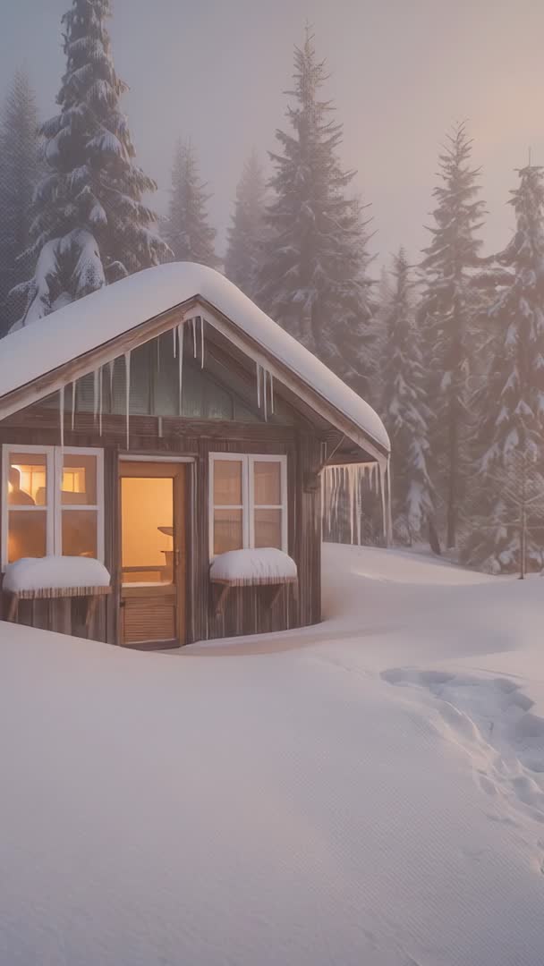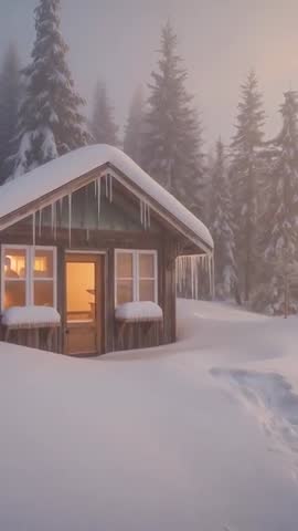 AI Generated Video. Vertical video showing camera panning across snow-covered terrain and revealing lit wooden cabin nestled among tall pine trees. Warm interior light glowing through windows and open door, creating contrast with cool blue tones of snow and soft fog. Icicles hanging from roofline and deep footprints leading toward cabin door, suggesting recent arrival or quiet exploration. Composition and motion working well for establishing shot, narrative opener, or atmospheric social content. Suitable for 9:16 vertical format and ideal for social media reels, travel promos, winter holiday adverts, real estate retreat listings, meditation or relaxation videos, short film openers, seasonal greeting cards, blog or website hero banners. Pairing with ambient audio such as crackling fire, gentle wind, muffled footsteps enhancing immersive feel. Color grading suggestions: warming midtones to emphasize cozy glow or cooling highlights for stark winter mood.
