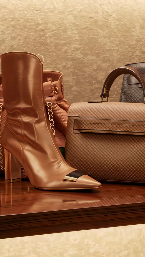 AI Generated Video. Panning camera revealing tan leather boot and designer bags on shelf, highlighting metal trim and textured leather. Vertical 9:16 format with slow left-to-right pan, shallow depth of field, warm neutral tones and ample copy space for text overlays. Showcasing product details and premium finish while creating cinematic retail mood. Use for Instagram Stories, TikTok ads, Pinterest Idea Pins, e-commerce product videos, website hero banners, in-store digital signage and fashion marketing campaigns. Pair with product details, price callouts or promotional messaging using left-hand copy space. Suitable for luxury branding, seasonal lookbooks, visual merchandising presentations and social commerce listings. Delivering elegant tactile feel and premium craftsmanship mood.