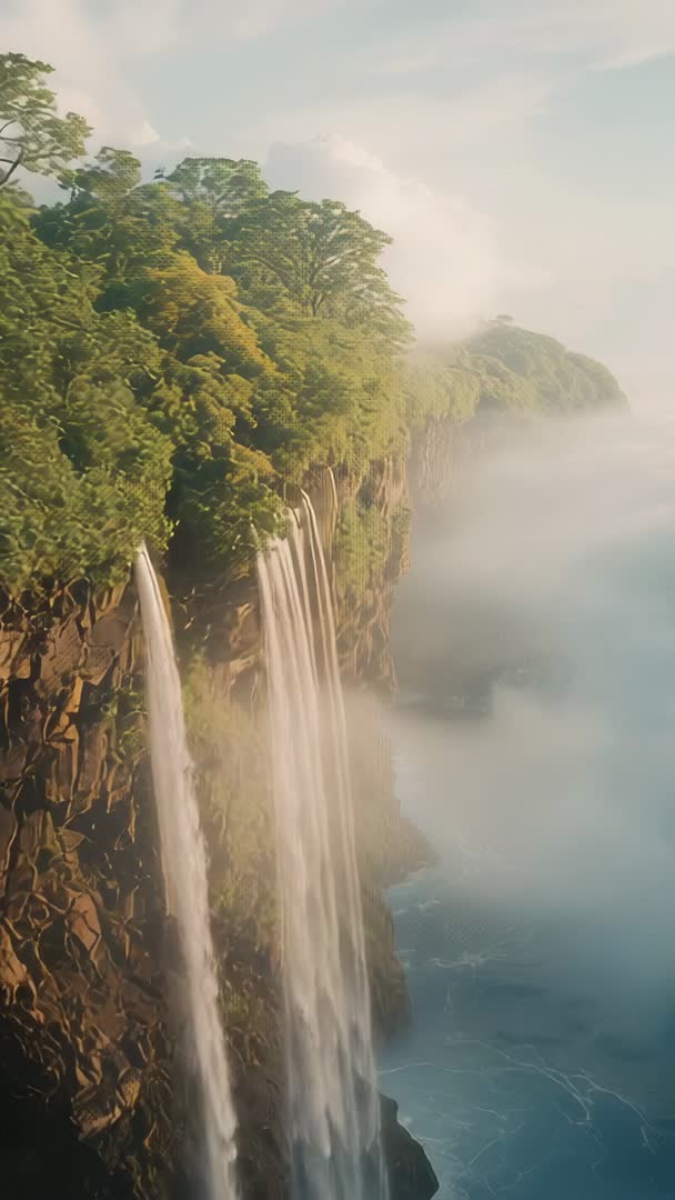 AI Generated Image. Panning vertical video revealing towering coastal cliff with waterfalls plunging into misty sea, framed by lush canopy and rugged rock face. Soft morning light filtering through fog and mist creating cinematic, ethereal mood. Vertical composition providing generous top and bottom copy space for titles, logos, or captions. Use for mobile-first content such as social media reels, Instagram Stories, TikTok backgrounds, and vertical ads. Work well as hero background for travel and tourism promos, nature documentaries, environmental campaigns, wellness and meditation videos. Pair with ambient sound design and slow typography to emphasize calm, scale, and drama. Suitable for stock footage libraries, website headers, app intros, or cinematic montages.