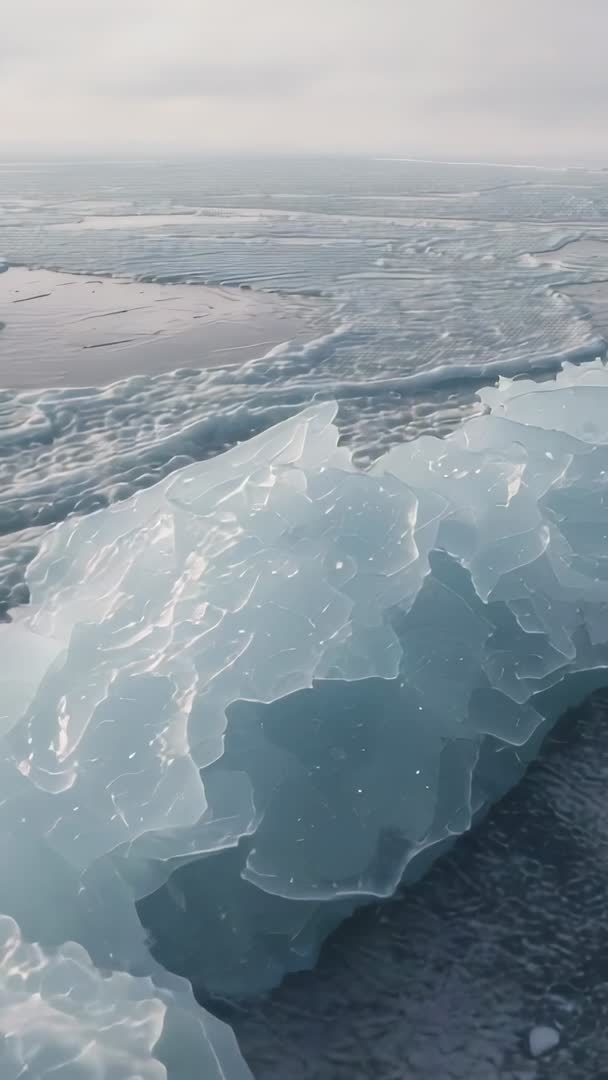 AI Generated Video. Panning across translucent glacial ice block resting on sea ice, revealing layered crystalline plates and shallow melt pools reflecting pale sky. Close-up frames capturing glossy, glass-like textures, fractures, and trapped air bubbles. Wide frames showing cracked floe patterns and rippled frozen ocean stretching into hazy horizon. Monochrome blue palette creating minimalist, cinematic mood suitable for title slates, documentary sequences, social media reels, and environmental campaigns. Recommended uses: climate change storytelling, nature cinematography, background for text overlays, mobile story formats, and branded video intros. Editing tips: looping by matching first and last frames, subtle color grade toward cool blues, pairing with ambient soundscape or soft piano, and adding slow parallax to emphasize depth.