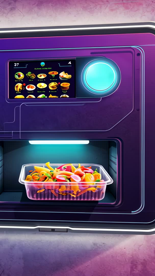 AI Generated Video. Panning vertical video revealing smart food unit mounted on purple metallic wall. Clear plastic tray holding colorful prepared meal sliding into illuminated cavity under cyan LED light, touchscreen display showing menu icons and glowing control dial. Futuristic aesthetic using neon gradients, rounded edges, and high-contrast color palette. Use for product demo, smart kitchen concept, food delivery packaging, automated vending and meal-prep services, UI walkthroughs, technology commercials, and social media reels. Vertical 9:16 composition ideal for mobile ads, Instagram Stories, TikTok, and app store previews. Suggestion for editors: crop or trim for loopable 5-15 second clips, add upbeat electronic soundtrack, overlay branded lower-third and menu callouts, highlight touchscreen interactions with animated graphics, and color grade for punchy cyan and magenta tones to emphasize futuristic mood.