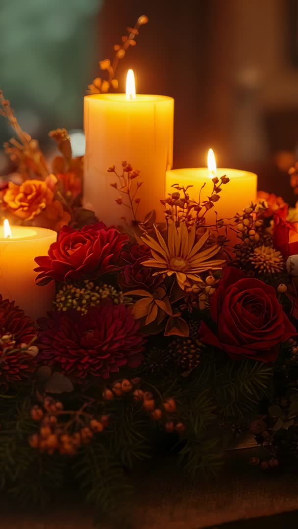 AI Generated Image. Panning camera capturing three lit pillar candles placed on home table amid rich red roses, chrysanthemums, and textured foliage. Warm candlelight casting soft golden glow, creating intimate cozy atmosphere with deep reds and amber highlights. Vertical video featuring slow panning motion and shallow depth of field for cinematic mood and smooth background bokeh. Use for romantic social media reels, wedding intro clips, holiday advertising, greeting card animations, meditation or relaxation app backgrounds, website hero banners, and product promotions for home decor or candle brands. Color grading options: enhance warm tones for festive feel or mute highlights for subtle, elegant look.