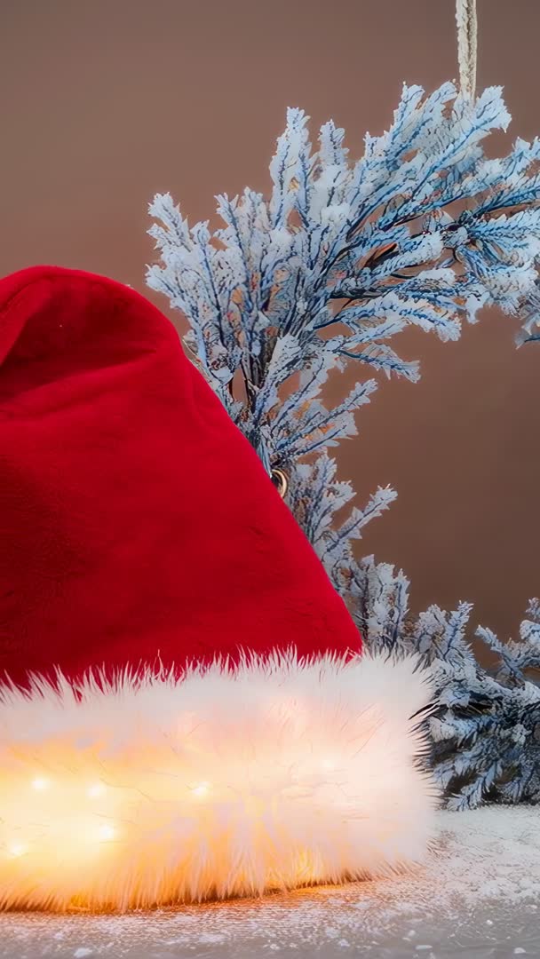 AI Generated Video. Featuring glowing faux-fur brim lit by warm fairy lights and red velvet Santa hat leaning against frosted wreath branch with hanging gold ring ornament. Panning movement revealing soft snow dusting on tabletop and delicate icy texture on conifer branch. Creating cozy holiday mood with warm light contrast against cool frosty tones. Ideal for holiday marketing, Instagram Reels, TikTok ads, seasonal product promos, greeting card video banners, website hero backgrounds and in-store digital signage. Allowing space at top for overlay text or logo; recommending looping short 5-10 second clip for social media. Suggesting gentle ambient jingle or crackling fireplace audio to enhance mood; recommending color grading toward warm highlights to emphasize glow. Providing closeup composition for product showcase, craft project demo or DIY ornament tutorial. Delivering versatile vertical format optimized for mobile-first campaigns and seasonal storytelling.