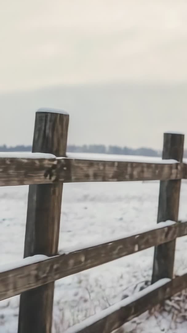 AI Generated Video. Vertical panning video showing snow-dusted split-rail fence stretching across frozen field under overcast sky. Close-up pans revealing weathered wood grain and snow buildup along rails, highlighting texture and pattern. Scene conveying quiet, isolation, seasonal transition, rural simplicity. Use for winter advertising, background footage for films or documentaries, social media vertical ads, website hero banners, real estate listings in cold climates, environmental or agricultural stories. Color grading options offering desaturated cool tones or warm contrast for nostalgic mood. Providing mobile-friendly vertical composition and gentle camera movement suitable for looping, slow-motion, or editorial cutaways.