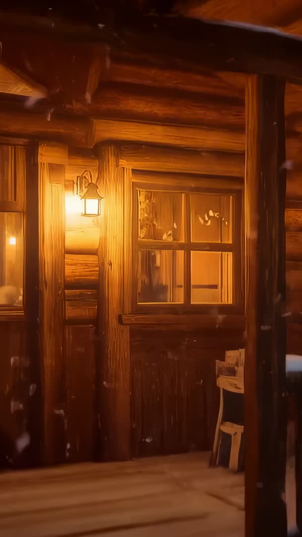 AI Generated Video. Panning camera showing snow-covered log cabin porch at dusk, warm string lights and lantern glowing through window and casting cozy amber reflection on wooden siding. Frame conveying rustic winter atmosphere, quiet snowfall, and intimate lodge ambiance. Ideal for seasonal advertising, holiday greeting reels, travel and lodge promotion, hospitality social media, background for winter product showcase, or cinematic title sequence. Suggestions for use: trimming for 9:16 social vertical ads, looping for ambient background in website hero banners, pairing with soft acoustic music and text overlay for event invitation or seasonal sale. Color palette emphasizing warm amber contrasted with cool blue snow, lending itself to vintage or hygge-themed campaigns.