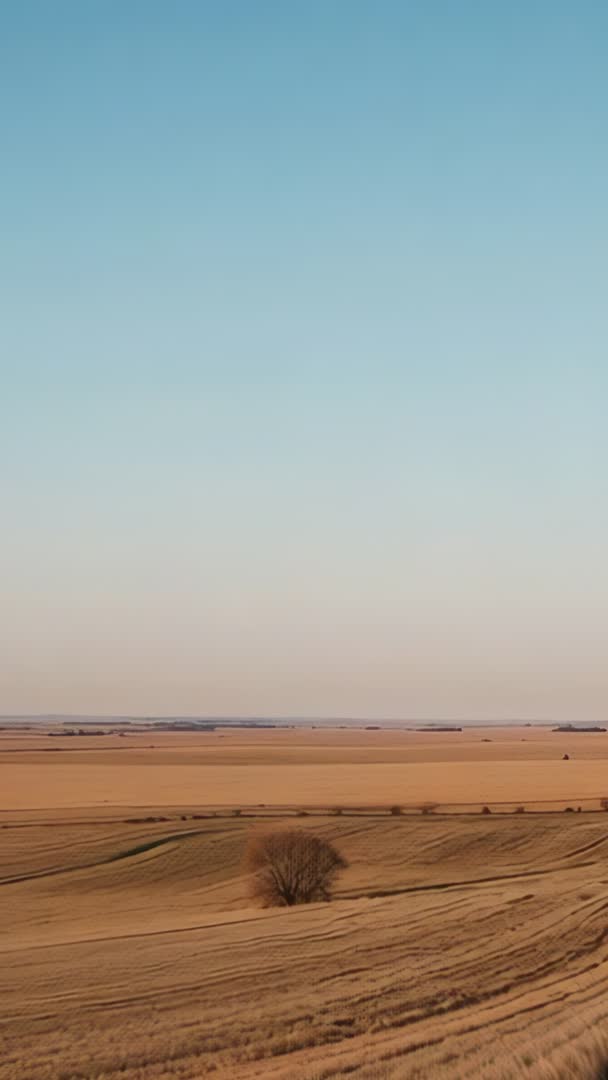 AI Generated Image. Panning slowly across rolling golden fields, showing solitary deciduous tree against vast blue sky. Conveying calm, solitude, and expansive rural atmosphere with strong vertical composition and ample negative space for overlay text or logos. Ideal for meditation app backgrounds, mobile hero banners, social media vertical ads, travel and agriculture documentaries, or environmental campaign spots. Working well as calming B-roll, title sequence, transition clip, or background for voiceover about rural life, farming, or seasonal harvest. Color palette offering warm golds and soft blues, usable for seasonal promotions and branding projects.