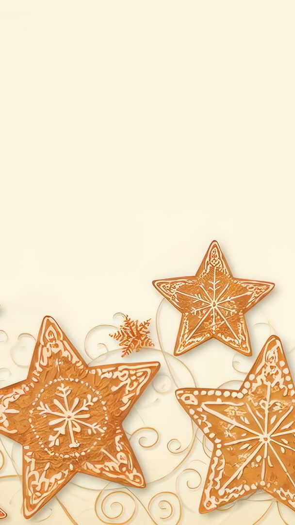 AI Generated Video. Featuring three star-shaped gingerbread cookies decorated with white icing resting on cream neutral card, panning vertically to create gentle motion while leaving ample top area for text overlays. Showing close-up details of intricate icing patterns and small decorative star shifting to add dynamic interest. Providing soft neutral palette and clean negative space for headline placement, logo reveal, or animated graphics. Ideal for holiday marketing, social media stories, vertical ads, greeting card videos, recipe intros, seasonal website headers, and festive promotional loops. Supplying loop-friendly movement and warm handmade baking vibe for use in campaigns, menus, e-cards, and packaging presentations.