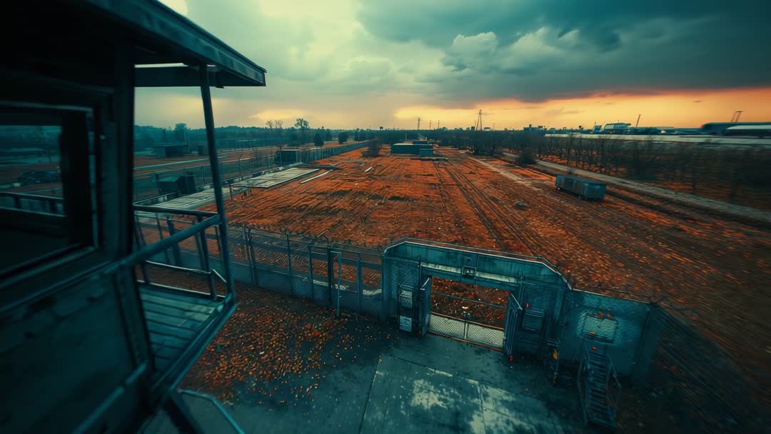 AI Generated Image. This video clip follows a panoramic overview of an urban industrial yard, revealing stark shipping containers scattered on a barren, leaf-covered landscape. The contrast of autumn-hued leaves with gray structures creates a dramatic and eerie setting, ideal for projects centered on themes of dystopia, urban decay, or deserted environments. Excellent for adding a background narrative of melancholy, exploring abandoned spaces, or examining themes of resilience and desolation in digital content like video games, documentaries, or artistic storytelling set in urban grounds.