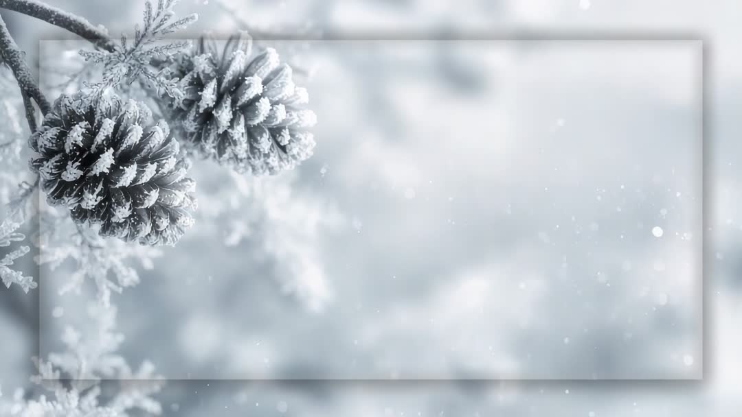 AI Generated Video. Video showing slow panning close-up of two frosted pinecones hanging from conifer twig, soft snowflakes falling and gentle bokeh creating tranquil winter atmosphere. Wide horizontal frame featuring blurred right-side panel for copy space and text overlays. Cool blue and icy white tones highlighting frost texture on cones and needles, shallow depth of field adding cinematic mood. Suitable for seasonal opener, holiday greeting animation, website hero banner, social media header, product background for winter promotions, TV lower-third or retail digital signage. Clip working well as loopable background or layered under titles and logos to add calm seasonal visual.