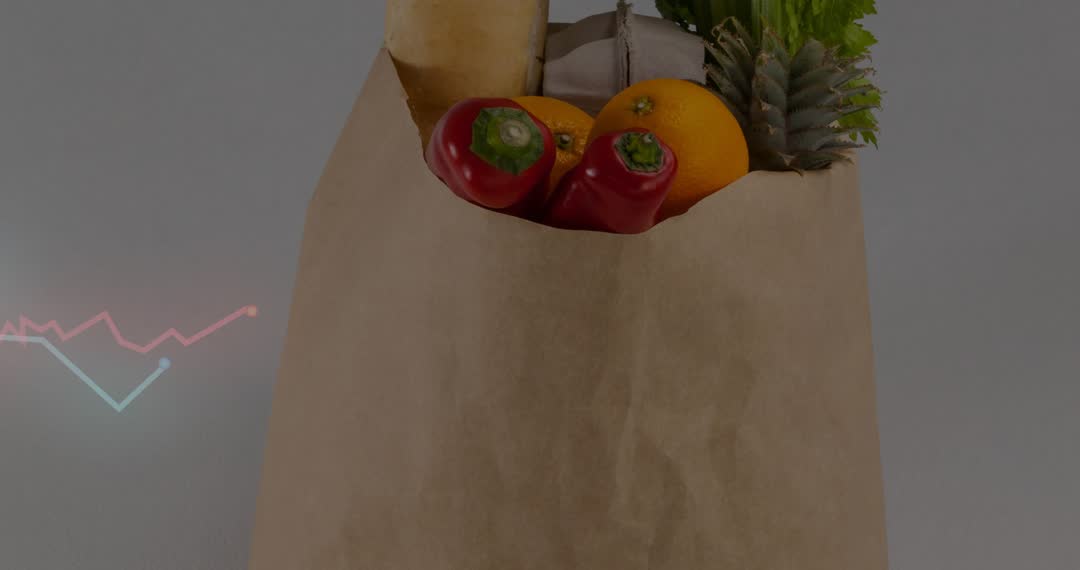 Video clip showing paper grocery bag filled with peppers, oranges, pineapple, and leafy greens while neon trend lines animate from left, oscillating and moving toward bag to visualize produce sales and demand shifts. Short loopable clip with neutral gray background and tight crop focusing on bag mouth and produce, creating clean composition for overlaying text or logos. Use for retail marketing campaigns, grocery e-commerce banners, seasonal sales promotions, social media ads, supermarket analytics presentations, and sustainability packaging stories. Work as animated hero for landing pages, data-driven explainer videos, slide decks illustrating consumer behavior and seasonality, or blog headers highlighting fresh food trends. Provide room for branding, headline captions, and call-to-action overlays.