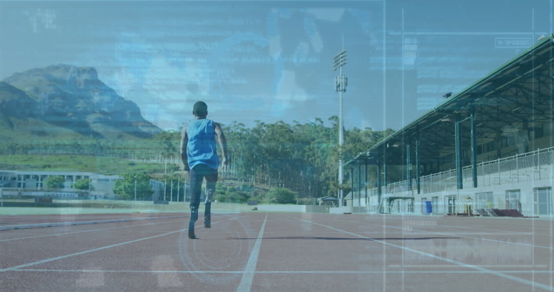 Shows a Paralympic athlete with a prosthetic leg running on a track while data interfaces are overlaid, illustrating the use of technology in sports to enhance performance. This could be useful for sports technology articles, presentations on athletic advancements, or motivational content for para-athletes.