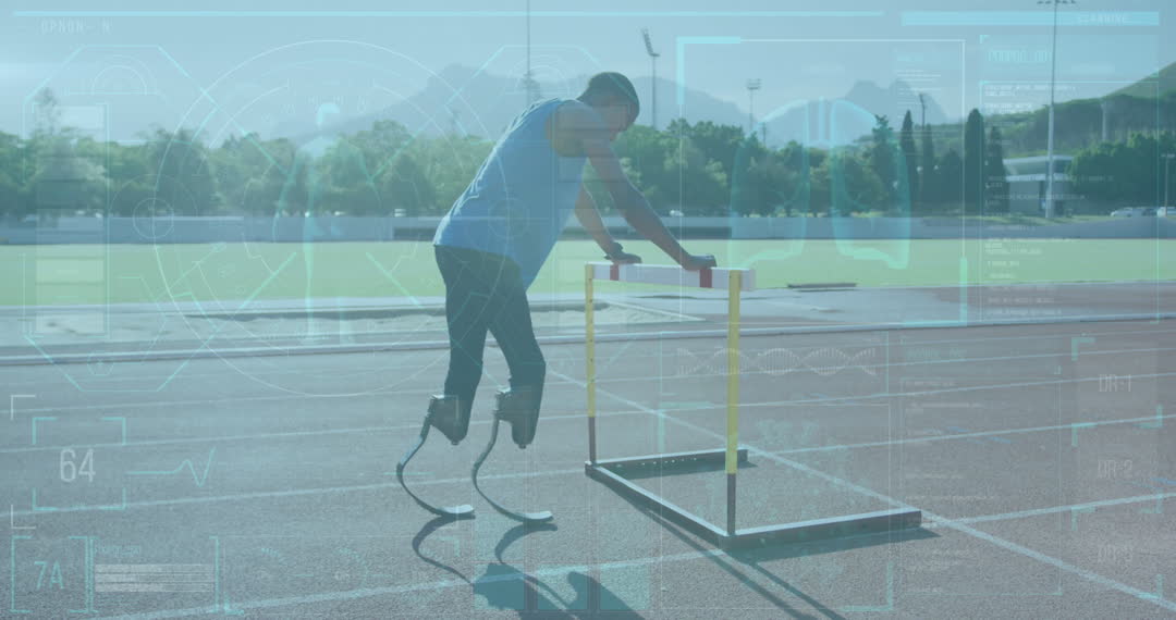 Man wearing running blades training at outdoor track with digital animation overlay. Reflects concepts of determination, sports technology, and Paralympic athletics. Useful for demonstrating inclusive sports, advanced prosthetics, and athletic achievement.