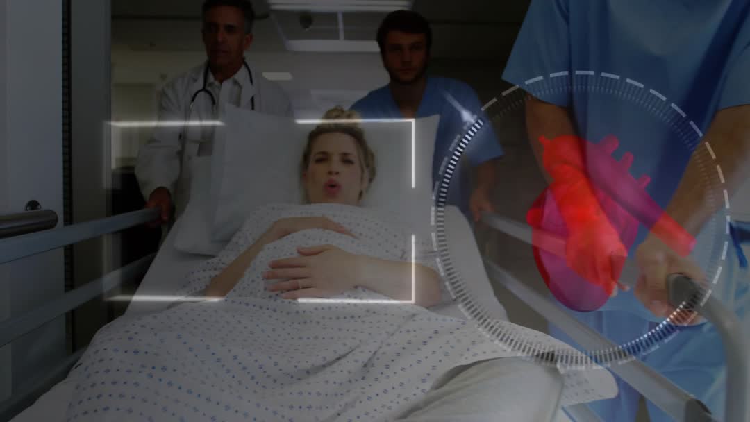 Video captures dedicated emergency medical team swiftly moving a patient on a stretcher down a hospital corridor. A dynamic heart scan overlay illustrates advanced medical technology in use as team commences synchronized response. Useful for illustrating healthcare technology, the teamwork in medical emergencies, and advances in medical diagnostic equipment applications.