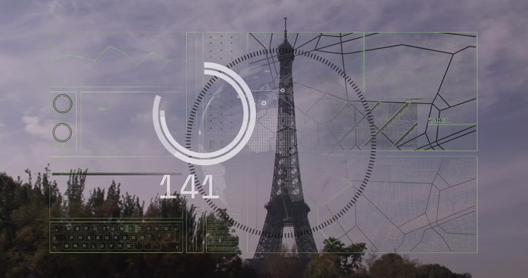 Animated financial graphics overlay iconic Paris cityscape, showcasing data processing and futuristic technology. Ideal for projects related to global business, financial analysis, or technology showcasing innovative city environments.