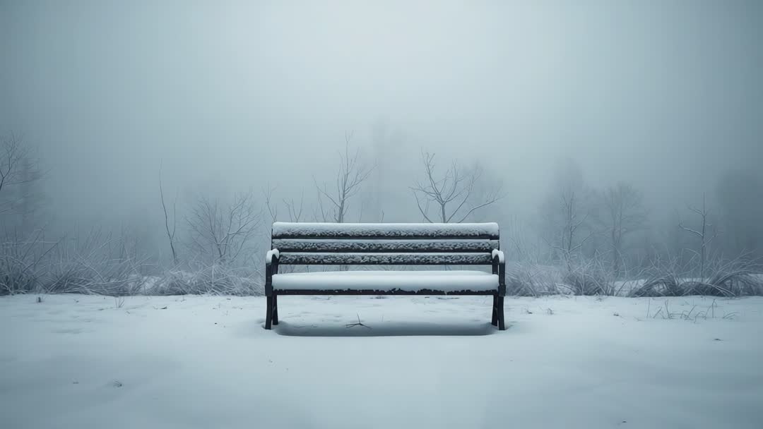 AI Generated Video. Depicting solitary wooden park bench centered on snowy ground, fog drifting through bare trees and low brush in background. Featuring muted blue-gray palette, soft diffused light, and strong negative space for text or graphics. Evoking feelings of solitude, stillness, quiet reflection, and winter melancholy. Serving as versatile footage for website headers, blog intros, seasonal marketing, mental health editorials, cinematic video openers, social media posts, greeting cards, and poster backgrounds. Allowing easy color grading and title placement thanks to symmetrical composition and uncluttered foreground. Working well for ambient background loops, cinematic transitions, and editorial storytelling about nature, isolation, or contemplative moments.