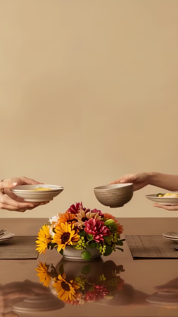 AI Generated Video. Showing close-up of two hands passing ceramic bowls across reflective wooden dining table with colorful sunflower and dahlia centerpiece creating mirror reflection. Warm neutral background and soft natural light highlighting food service and intimate moments. Offering vertical 9:16 framing, shallow depth of field, warm color palette, clean composition for mobile-first content. Suggesting uses: Use for social media vertical ads, recipe reels, restaurant promotion clips, family lifestyle stories, seasonal autumn campaigns, table decor tutorials, hospitality branding. Pair with recipe overlay text, logo reveal, slow-motion reveal, gentle music, or voiceover about sharing meals. Crop for Instagram Reels, TikTok, Facebook Stories, or mobile landing pages. Provide caption ideas for marketing: "Passing warmth", "Sharing dinner", "Tabletime together".
