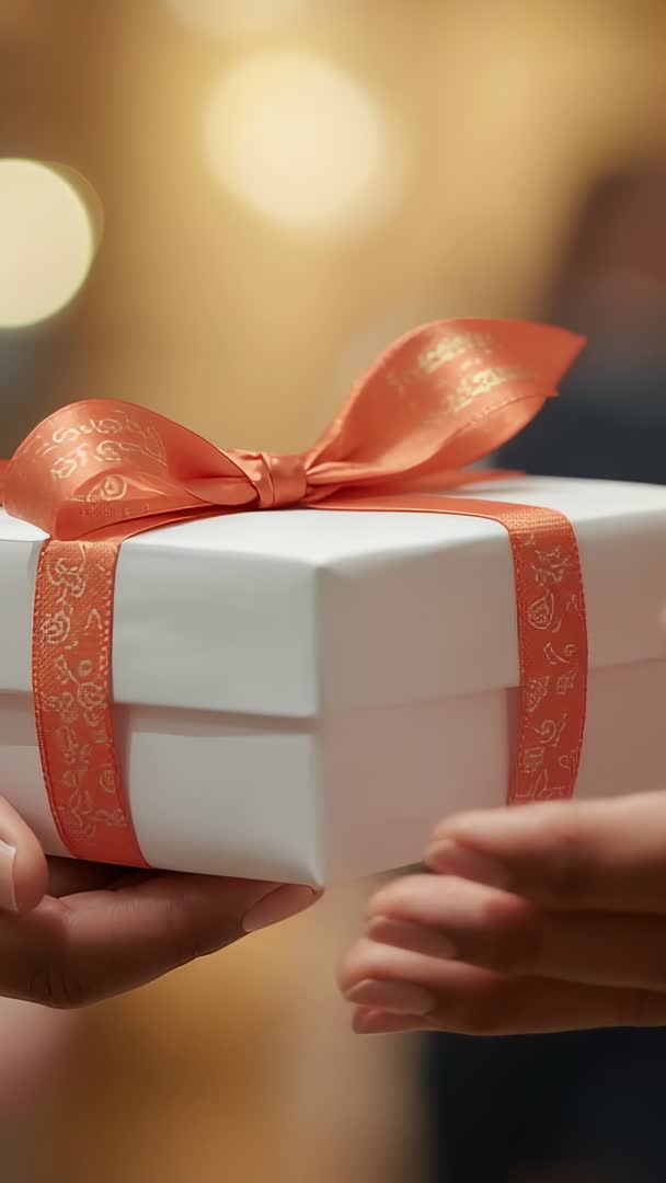 AI Generated Video. Vertical clip showing hands passing white gift box tied with orange ribbon against warm bokeh lights. Closeup framing and shallow depth of field creating intimate mood while highlighting ribbon texture and hand interaction. Use for social media stories, mobile ads, e-commerce banners, holiday campaigns, wedding and anniversary promos, unboxing sequences, greeting card backgrounds, and gift guide visuals. Ideal for conveying generosity, surprise, romance, celebration, and cozy festive atmosphere. Editing suggestions: crop for vertical formats, add soft ambient music, apply warm color grading, and place product or brand overlays on lower third for promotional use.