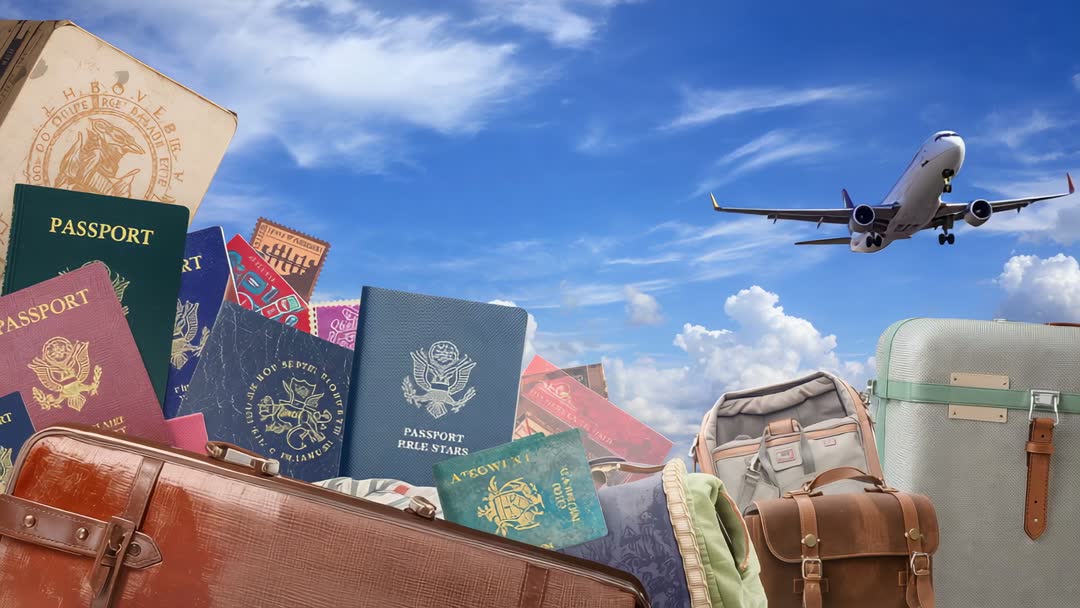 AI Generated Image. Video showing pile of passports and assorted luggage in foreground with passenger jet approaching from right under bright blue sky. Composition highlighting travel documents, international travel theme, and preflight preparation. Useful for travel agency promos, airline marketing, visa and passport informational videos, travel safety and documentation tutorials, and blog headers about international trips. Visual elements include varied passport colors, vintage leather suitcase, modern carry-on, backpack, and plane in landing approach. Mood conveying excitement, anticipation, and travel readiness. Suggested uses: website hero banners, social media reels, travel booking ads, airport signage mockups, editorial content about visa requirements and travel tips. Suggested color grading: boost contrast, enhance blues, add warm tones to luggage for vintage feel. Composition allowing crop for horizontal or square formats without losing main elements. Shot supporting messaging about last-minute packing, passport checks, lost luggage warnings, and travel insurance promotions.
