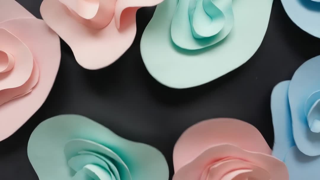 AI Generated Video. Layered pastel paper flowers are positioned on a black surface, delicately sliding down. This minimalist display accentuates the floral craftsmanship and evokes a sense of serenity and elegance. Perfect for use in creative projects about arts and crafts, interior design, or as an elegant backdrop for events requiring a floral aesthetic.