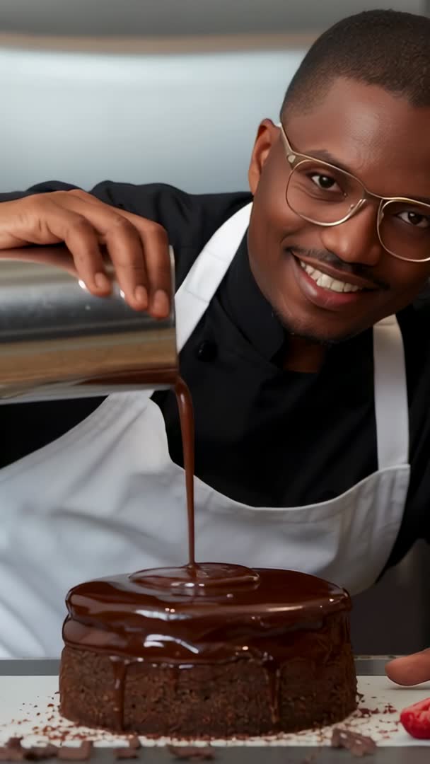AI Generated Image. Close-up vertical video showing pastry chef pouring glossy chocolate ganache over chocolate cake while smiling. Scene highlighting precise pouring technique, smooth ganache texture, and reflective surface for strong visual impact. Ideal for social media reels, Instagram and TikTok tutorials, and behind-scenes bakery content. Useful for website hero banners, digital ads for patisserie or chocolatier, recipe blog step-by-step guides, cooking school promos, and menu or packaging visuals. Recommend using slow-motion or loop edit to emphasize glossy flow; add upbeat music and on-screen text for recipe tips. Color palette matching warm, neutral backgrounds and modern minimalist branding.