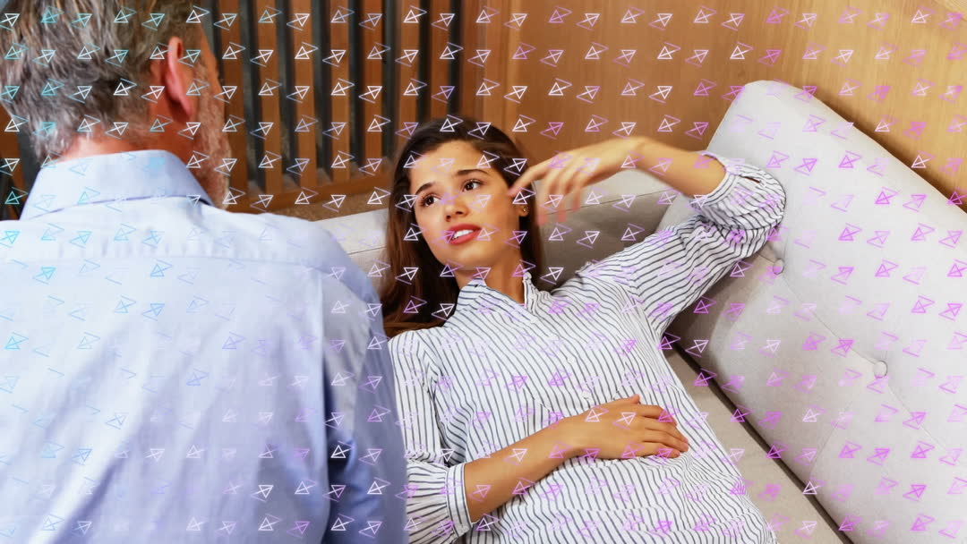 Depicts a patient and doctor engaged in conversation in clinical environment. Translucent modern abstract pattern overlays convey a sense of digital interface, symbolizing technology in healthcare communication. Useful for material on patient care, doctor-patient relations, modern healthcare approaches, innovative clinic design.