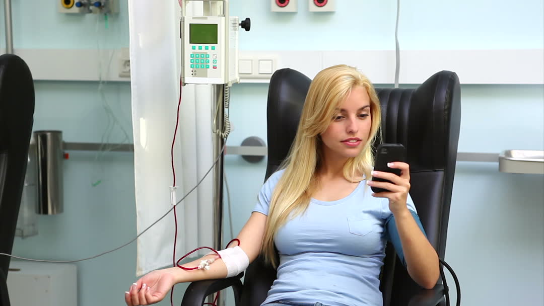 Patient Engaging with Phone During Blood Donation in Clinic Video
