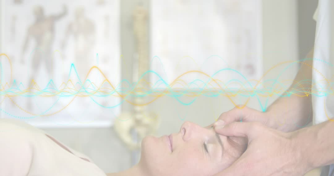 This scene captures a patient in a peaceful state while undergoing a relaxing holistic therapy. Therapist gently works on the patient's temples, symbolizing effective alternative healing techniques such as acupuncture or touch therapy. Transparent waveforms flowing alongside reveal depth, adding a visual layer of tranquility, energy flow and harmony. Useful for topics on tranquil healthcare, wellness treatments, holistic healing and stress relief. Ideal for holistic therapy publications, wellness retreats or advertising for spa and acupuncture services.