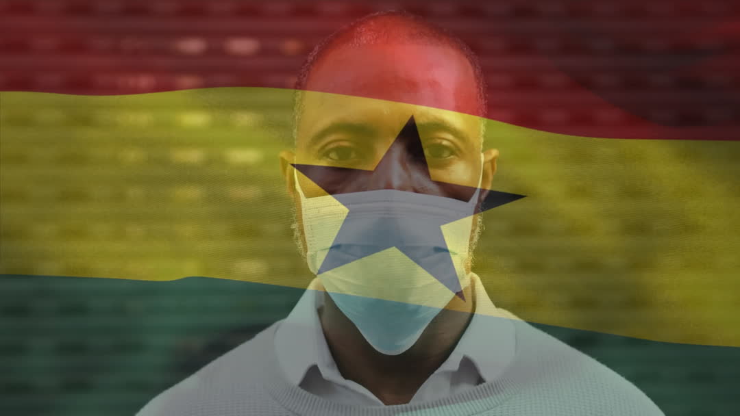Image depicts an African American man wearing a face mask as the flag of Ghana is superimposed on him, symbolizing resilience and health awareness during a pandemic. Useful for materials focusing on cultural identity, health safety protocols, or pandemic response in Ghana or African communities.