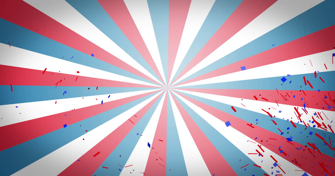 Image featuring vibrant red, white, and blue spinning stripes resembling an American flag background adorned with multi-colored confetti. Ideal for use in content related to U.S. Elections, patriotic events, national celebrations, Independence Day promotions, or democratic promotions, adding a festive and dynamic touch.