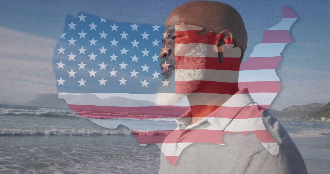 This picture combines a thoughtful mature male silhouette with an American flag and backdrop of serene ocean waves. The blended visual of national pride and natural beauty evokes a reflective and contemplative mood, perfect for campaigns reflecting patriotism or themed events. Use it in patriotic articles, reflections on nature’s beauty, or expressions of American culture and identity.
