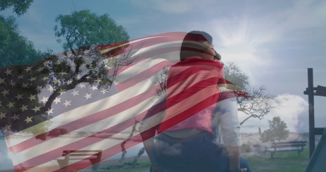 This video depicts a contemplative moment with a person sitting on a bench, also showing a waving American flag overlayed on the scenery, underscoring themes of patriotism and freedom. It can be utilized for content related to Americana, patriotic events, Independence Day celebrations, or outdoor ventures emphasizing national pride.