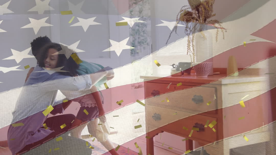 Overlay of the USA flag with an African American father and daughter hugging creates a sense of unity and celebration. Confetti adds a festive atmosphere depicting a happy and patriotic moment in a home setting. Useful for illustrating themes of family bonding, national pride, or patriotic holidays such as Independence Day and Thanksgiving.