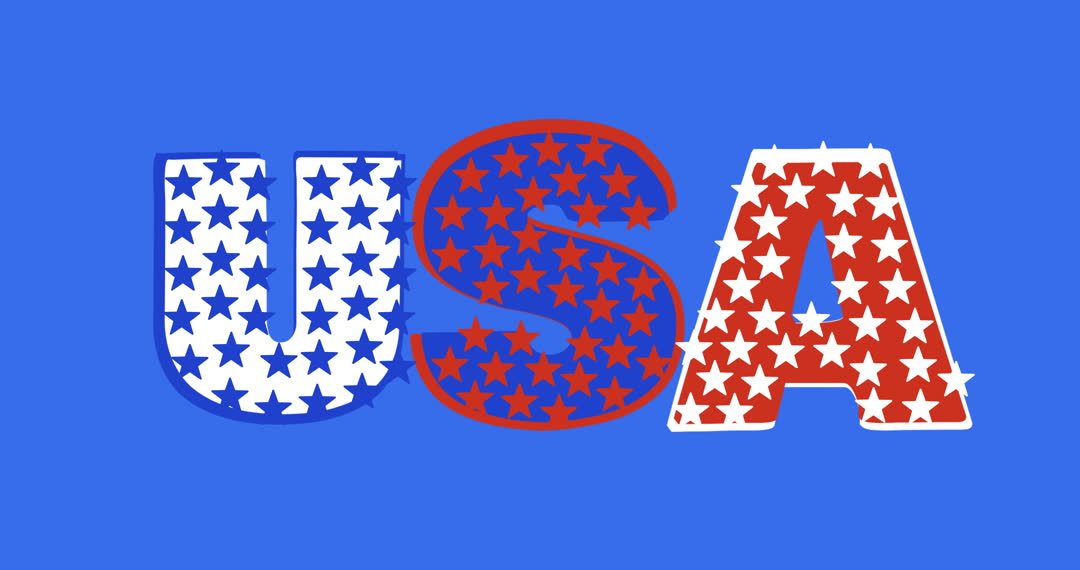 The video shows bold 'USA' text filled with star patterns and set against a blue background. The colors red, white, and blue highlight the theme of patriotism and American pride. Suitable for use in contexts related to celebrations of American holidays, national events, or patriotic themes in graphic design and digital content creation.