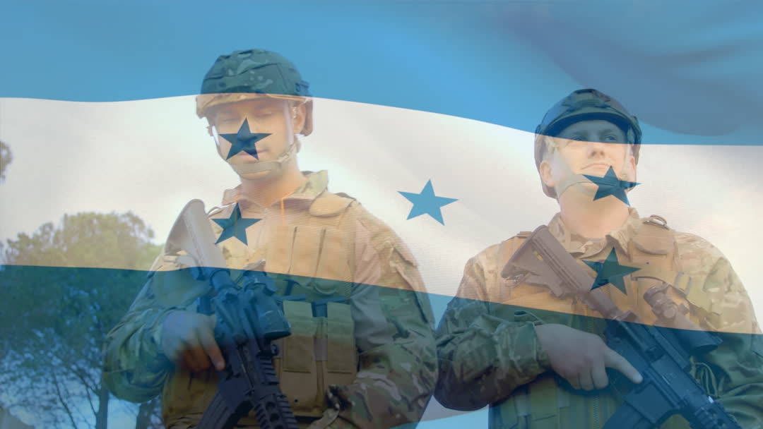 The scene features a blend of patriotic elements, showcasing an overlay of the Honduran flag and symbols alongside armed military personnel. Such videory emphasizes themes of national pride, security, and global relations. It is ideal for use in articles or contexts related to military studies, international diplomacy, or cultural discussions involving national identity across nations.