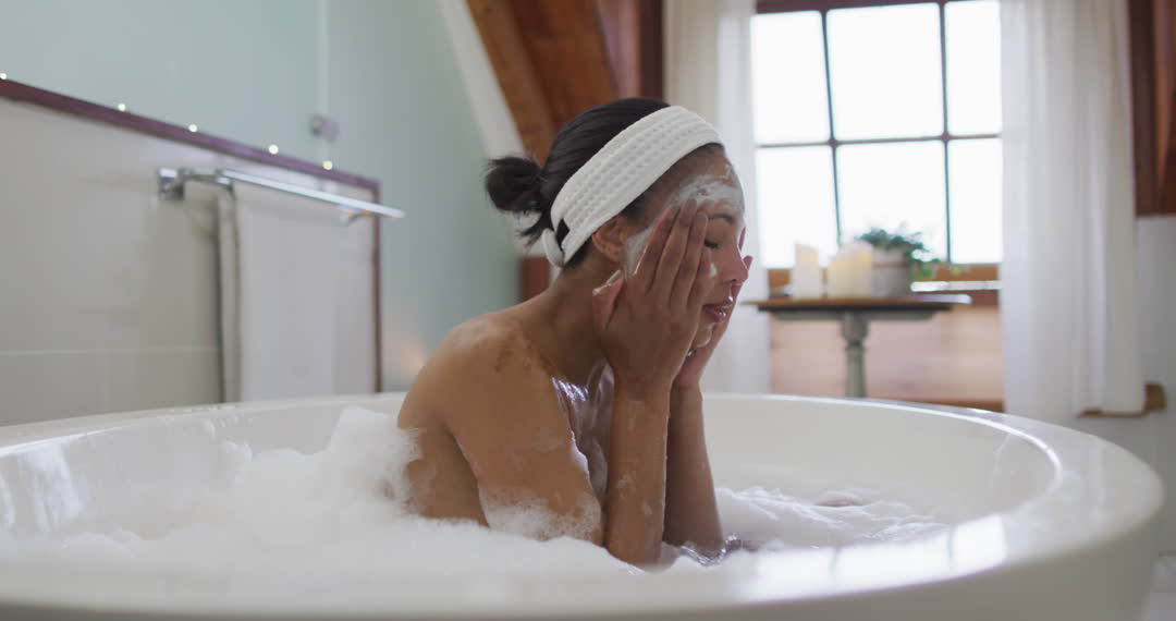 A woman enjoys a moment of relaxation in a bubble bath, applying facial cleanser with care. Natural light fills the room, creating a serene and calming atmosphere. Suitable for content focused on lifestyle, self-care, relaxation, and personal well-being.