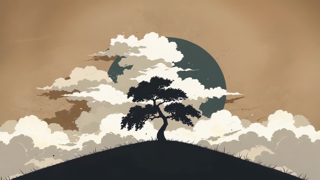 AI Generated Image. Peaceful video scene showcasing drifting clouds softly passing over a round contrasting background behind a solitary tree on a grassy hill. This tranquil, minimalist artwork captures nature's grace in warm hues, evoking serenity and calm. Perfect for use in projects focused on relaxation, tranquility themes, mindfulness content or as inspiring visual art in creative and meditative mediums.