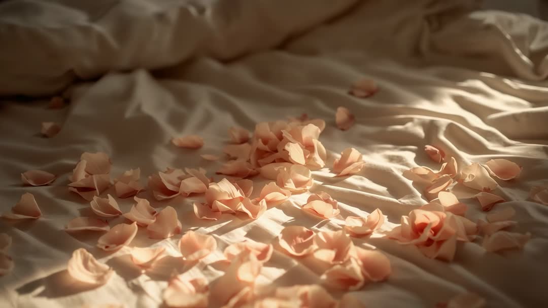 AI Generated Image. Soft peach rose petals scattering across rumpled cream satin bedspread, sunlight sculpting fabric folds and casting warm highlights. Slow-motion clip capturing delicate petal movement and gentle landing, creating romantic and intimate mood. Ideal for wedding montages, bridal commercials, fragrance and beauty campaigns, lifestyle reels, social media shorts, and mood-driven title sequences. Color palette featuring soft peach, warm cream, and pastel tones, matching luxury and slow-living themes. Footage offering close-up texture shots, shallow depth of field, and pleasing bokeh, enabling editors to crop and time for dramatic reveals or smooth transitions. Licensing suggestions include premium stock libraries, wedding film packages, boutique brand campaigns, and online content for romantic or calming narratives.