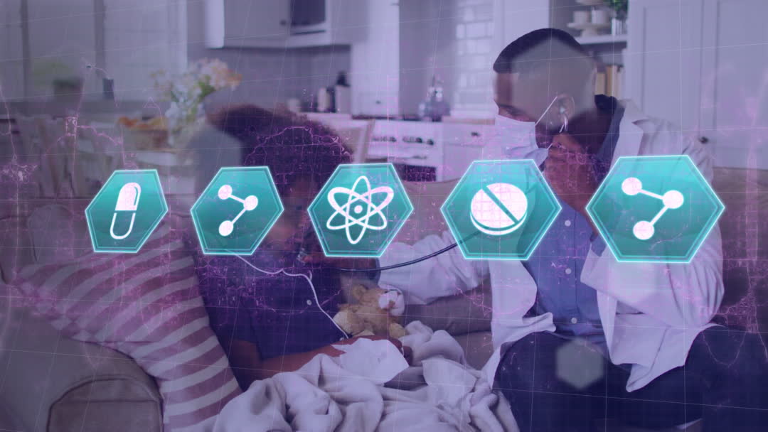 Pediatrician in a protective mask examines a child in their home heightened by overlays of digital medical icons. The video suggests a fusion of traditional medical care with modern technology, providing a futuristic look at healthcare. Useful for topics on telemedicine, healthcare advances, and digital transformation in medical practice. Illustrates the importance of child healthcare during a pandemic and the integration of new tech in everyday medical practices.